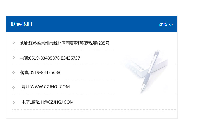 地址:常州市新北區友邦商務大廈1幢16、17層  電話:0519-85101652  傳真:0519-85112595  郵編:213022  網址:www.cz-jiayue_cn.szdiaosudaoju.com  郵箱:xiajifengaa@163.com